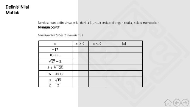 Materi Persamaan Nilai Mutlak Ppt from slideplayer.info Diposkan pada 3 september 2015 oleh agilhasan. Nilai mutlak yaitu nilai suatu bilangan riil tanpa tanda plus atau minus. Tujuan pembelajaran prev menu next Dikarenakan jarak itu selalu positif atau. Pada umumnya bentuk umum dari fungsi kuadrat adalah f x ax 2 bx c atau y ax 2 bx c suatu fungsi selalu berkaitan dengan grafik. Banyak langkah selalu dinyatakan dengan bilangan bulat positif walaupun arahnya ke arah sumbu x negatif. • 4.1.1.1 siswa dapat menggunakan konsep nilai mutlak untuk menyelesaikan masalah kontekstual yang berkaitan dengan nilai mutlak dengan tepat jika diberikan masalah kontekstual melalui diskusi kelompok. Misalkan fx suatu fungsi dalam variabel x maka berlaku fungsi nilai.